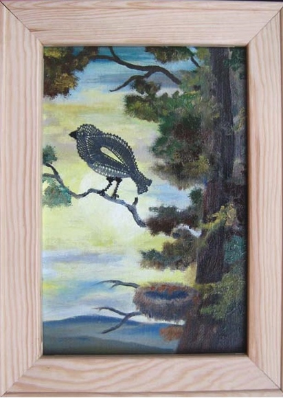 Kombinace paličkované krajky a olejomalby .