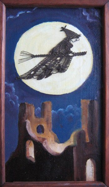 Kombinace paličkované krajky a olejomalby .