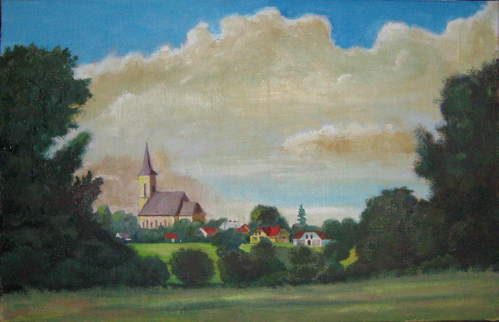 Olej na akrylu/překližka Dohaličky(Horní Dohalice/Dohalice) jsou obec poblíž Hradce Králové.